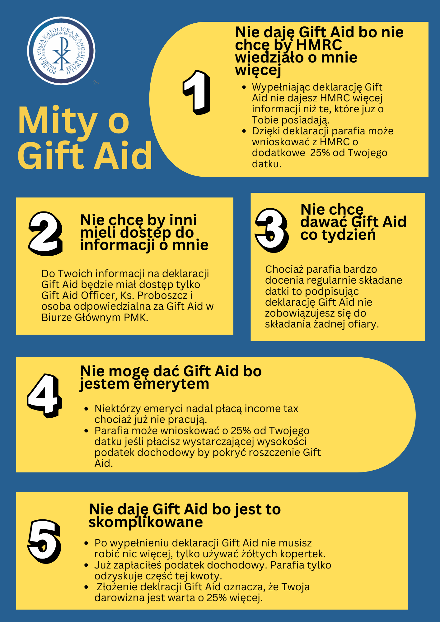 Od każdej sumy wpłaconej w systemie GIFT AID (ofiara przekazana w żółtej kopercie) Parafia otrzyma dodatkowo z Urzędu Podatkowego 20% od ofiarowanej sumy (jest to zwrot pobranego podatku).